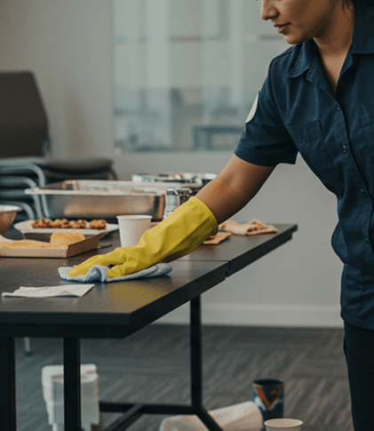 Break Rooms & Dining Areas: Sanitizing surfaces, emptying trash, and restocking essentials.